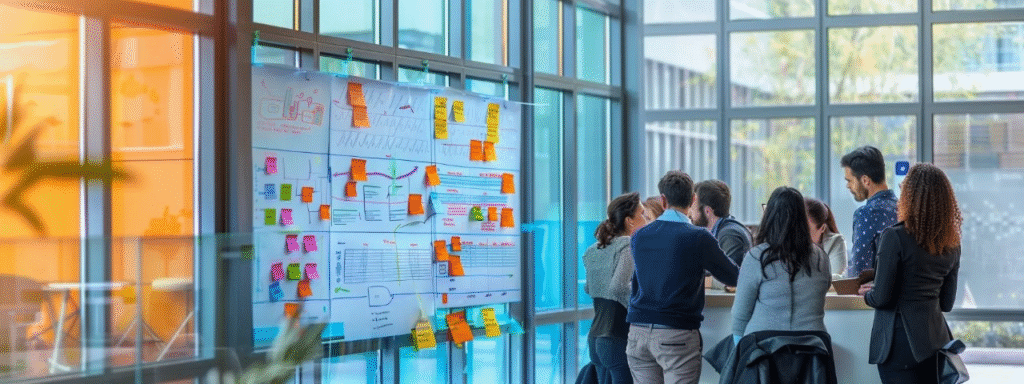 Alt text: Multiple employees are having a meeting and discussing the data they have pulled from customer segmentation software and placed onto a whiteboard