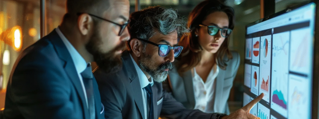 Alt text: Three employees point at a screen and discuss data from customer segmentation software